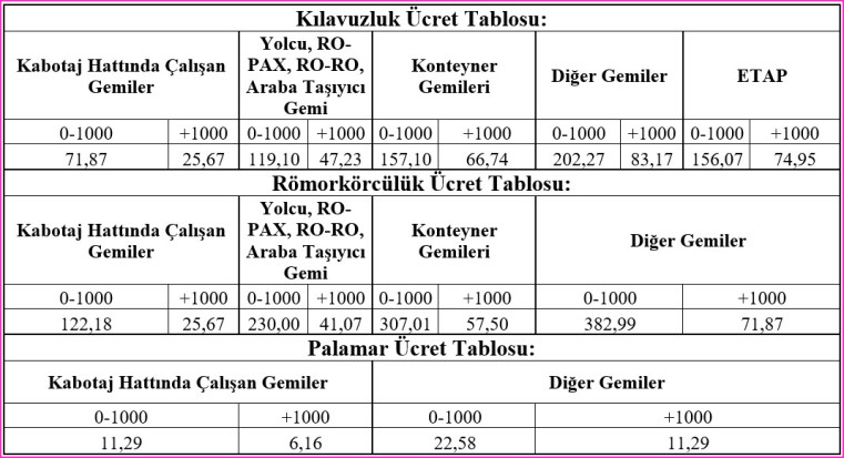 19.09.2024 tarihli ve 2187670 sayılı Bakanlık Makam Olur’u ile yayımlanan Kılavuzluk ve Römorkörcülük ile Palamar Hizmetlerinin Ücretleri Hakkında Yönerge’nin Ücretlerin Uygulanmasına İlişkin Kurallar başlıklı 5. Maddesinin birinci fıkrasının (b) bendi uyarınca 1 Şubat 2026 – 31 Ocak 2027 tarihleri (belirtilen tarihler dahil) arasında uygulanacak Kılavuzluk, Römorkör ve Palamar ücretleri aşağıdaki gibidir.